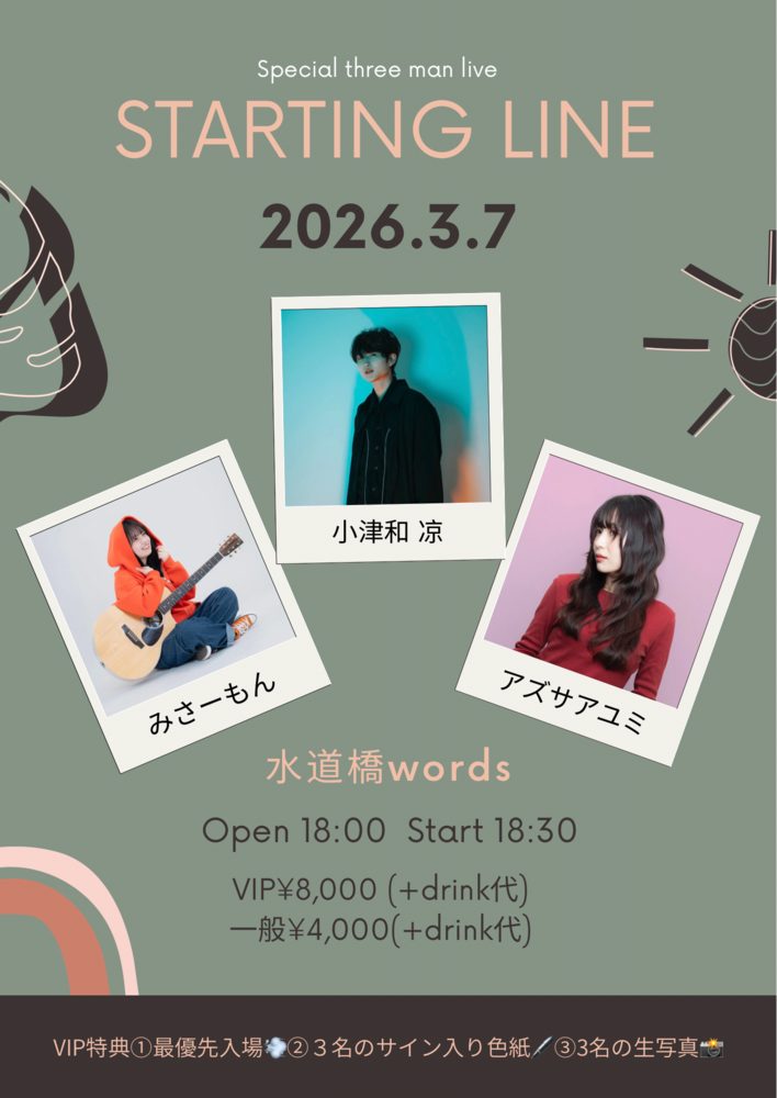 STARTING LINE SCHEDULE 2026/03/07(土) 水道橋words Open18:00/Start18:30 STARTING LINE 2026/3/7(土)OPEN 18:00 / START 18:30📍水道橋Words 出演:みさーもん / アズサアユミ / 小津和 涼 🎫VIP(限定20名)8,000円+D優先入場 / 出演者全員サイン色紙 / 出演者3名生写真 🎫一般4,000円+D チケット予約はこちら🎫 URLをコピーする 報告する